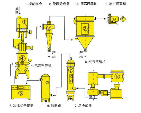 | AFM流化床式氣流粉碎機(jī)工藝流程圖 |