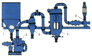 | 1 料倉 2 主機(jī) 3 旋風(fēng)分離器 4 布袋捕集器 5 高壓風(fēng)機(jī) |